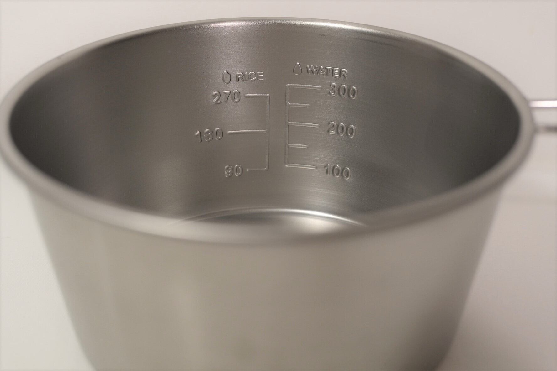 また、内側には「RICE」目盛りをエンボス処理しており、90ml≒0.5合としてお米の量を計ることも可能です。